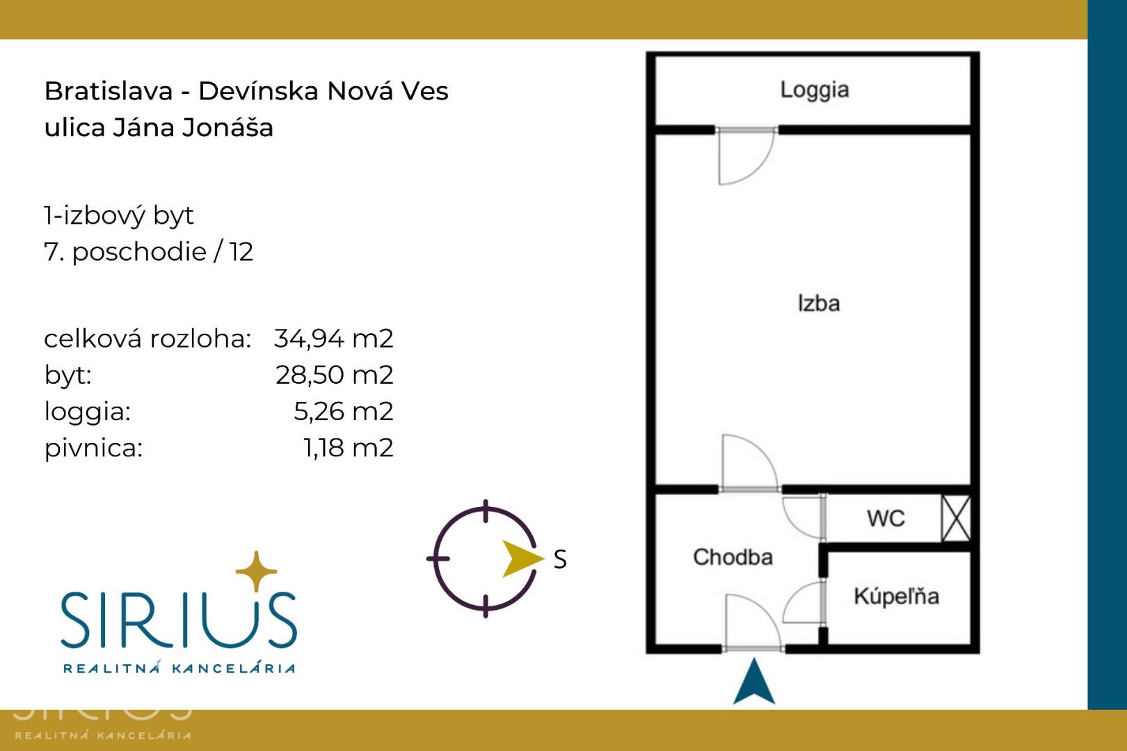 • celková plocha 34,94 m2 (byt 28,5 m2 + loggia 5,26 m2 + pivnica 1,18 m2)