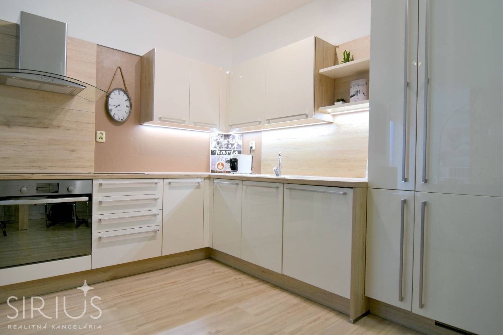 • plne vybavená kuchynská linka so zabudovanými spotrebičmi: elektrická rúra, varná doska, digestor, chladnička s mrazničkou, umývačka