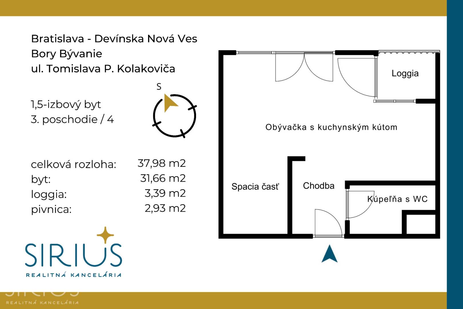 • celková plocha: 37,98 m2 (byt 31,66 m2 + loggia 3,39 m2 + pivnica 2,93 m2)