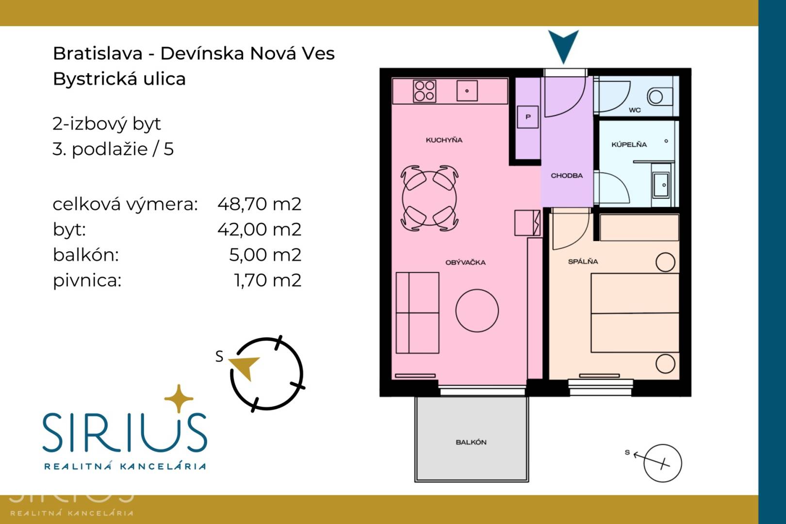 • celková plocha 48,7 m2 (byt 42 m2 + loggia 5 m2 + pivnica 1,7 m2)