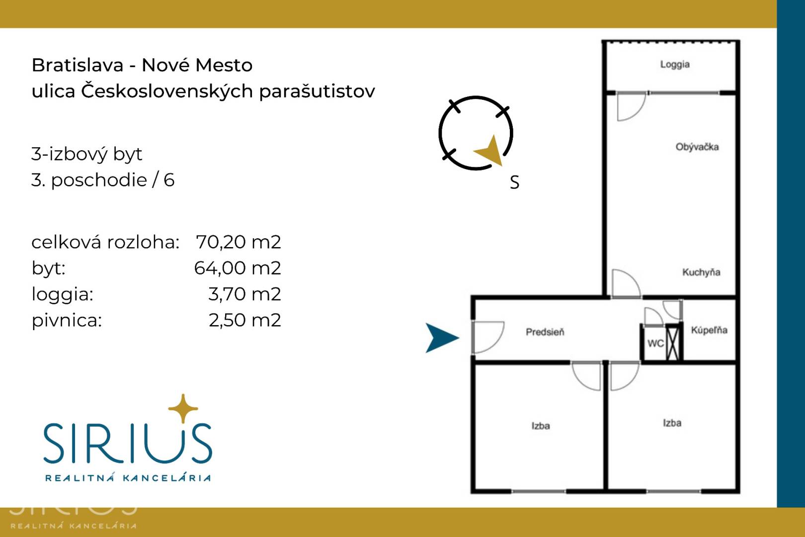 • celková plocha: 70,20 m2 (byt 64,00 m2 + loggia 3,70 m2 + pivnica 2,50 m2)