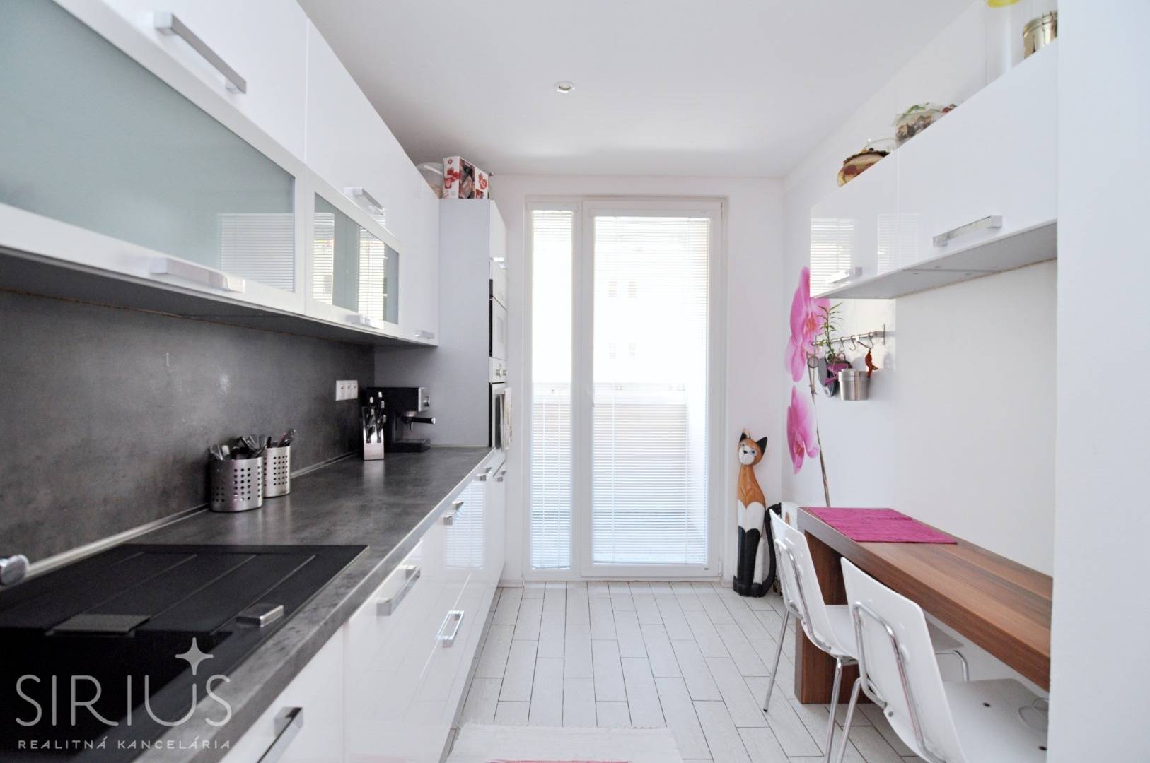 • kuchynská linka so vstavanými spotrebičmi – indukčná varná doska, vstavaná elektrická rúra, umývačka riadu, digestor, filter na vodu, granitový drez, výstup na presklenú loggiu s veľkým francúzskym oknom