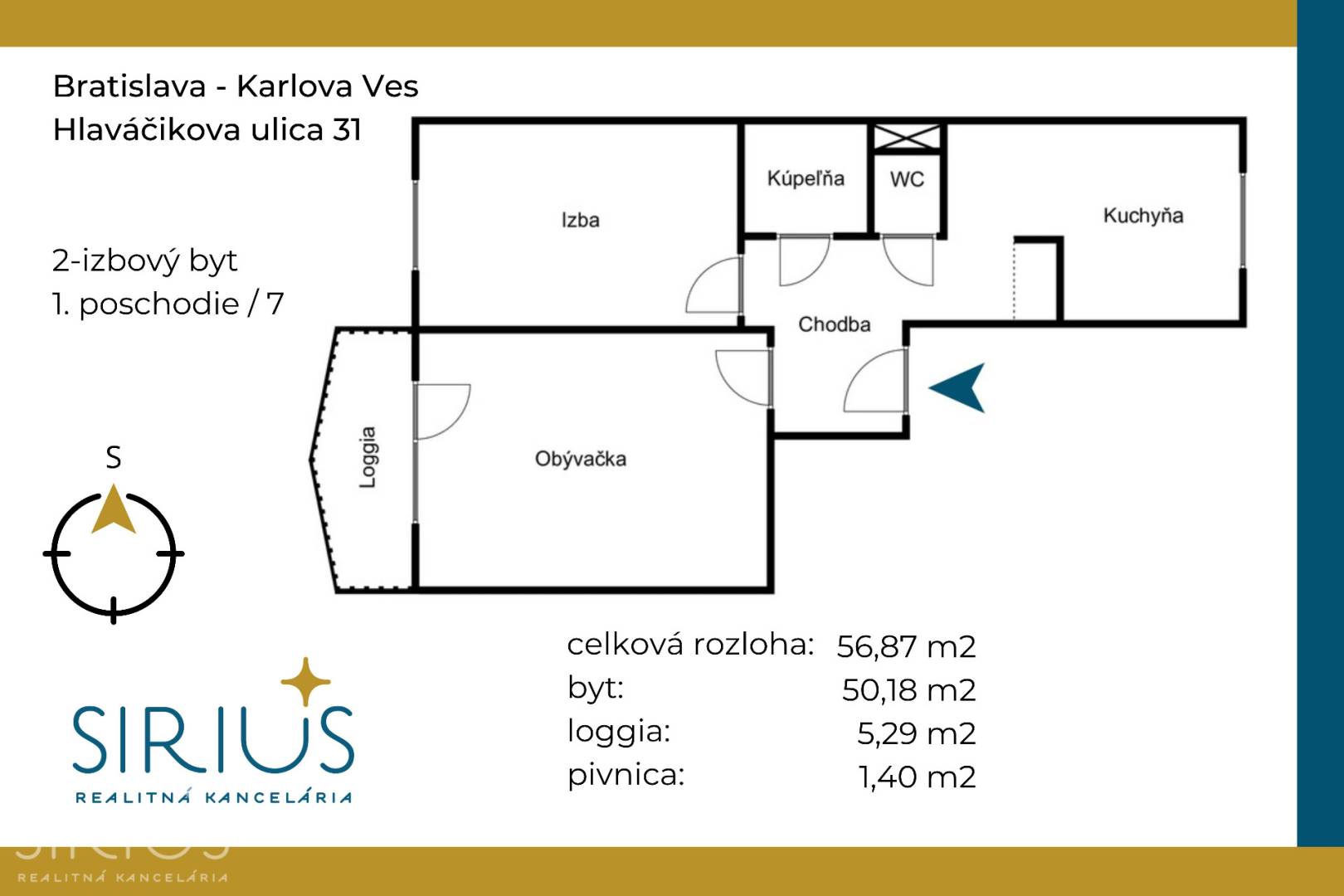 • celková plocha: 56,87 m2 (byt 50,18 m2 + loggia 5,29 m2 + pivnica 1,40 m2)