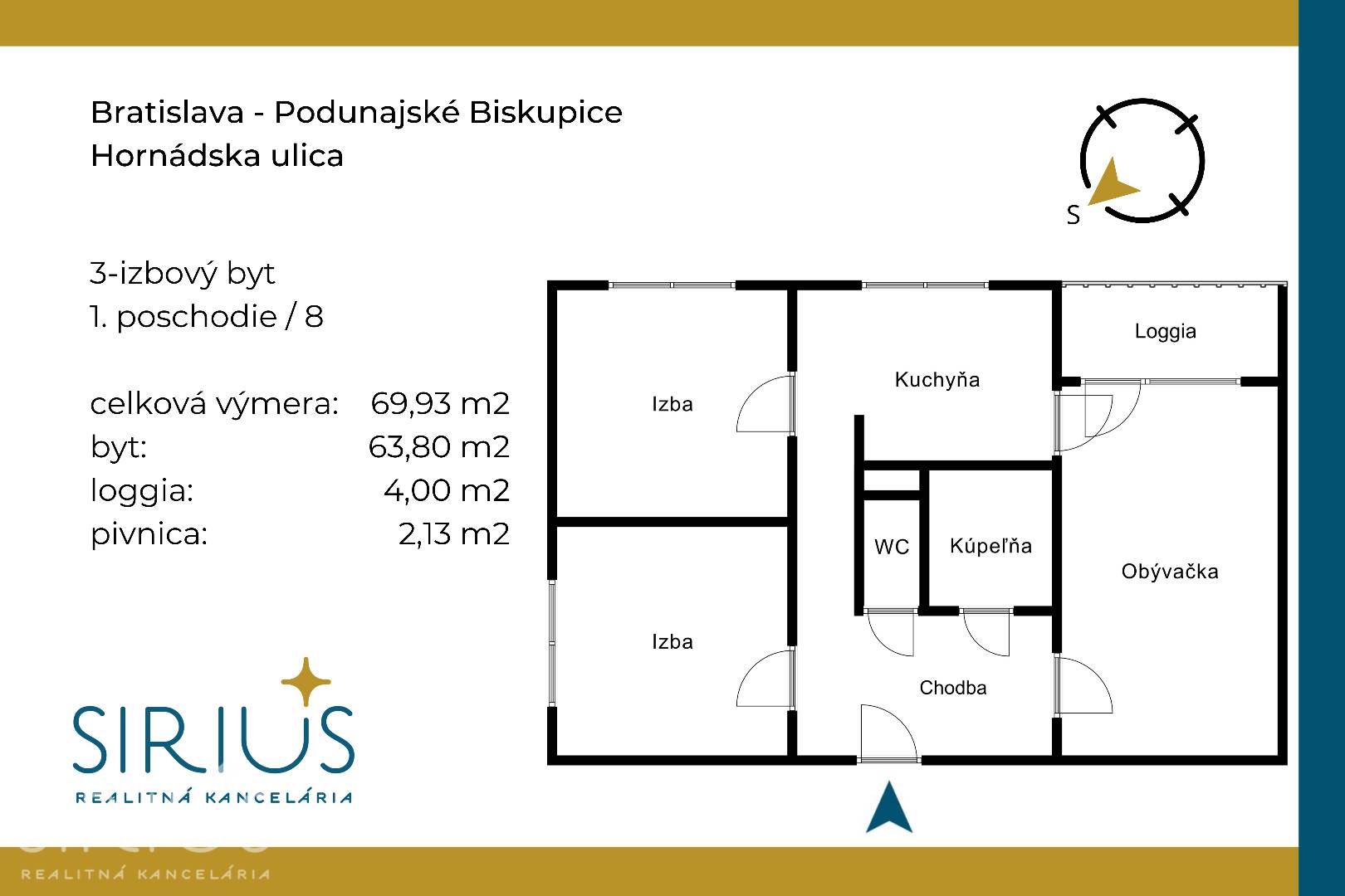celková plocha: 69,93 m2 (byt 63,80 m2 + loggia 4,00 m2 + pivnica 2,13 m2)