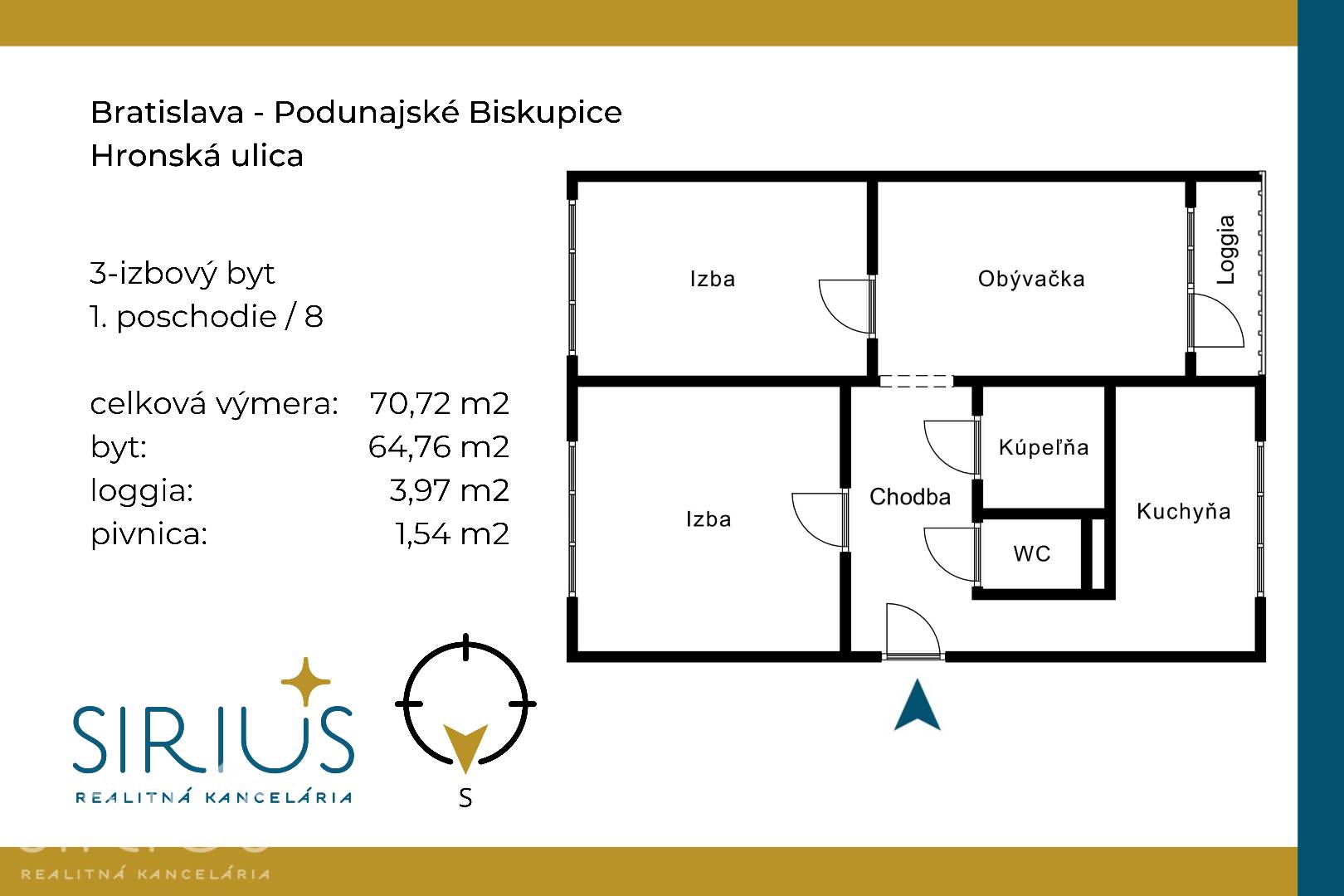 • celková plocha: 70,72 m2 (byt 64,76 m2 + loggia 3,97m2 +pivnica 1,54 m2)