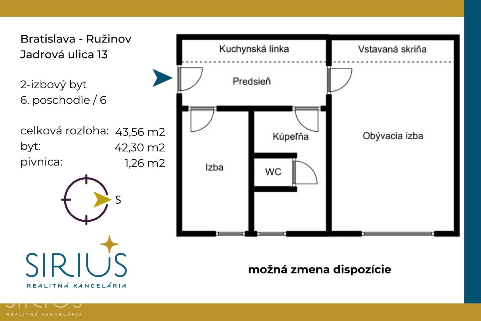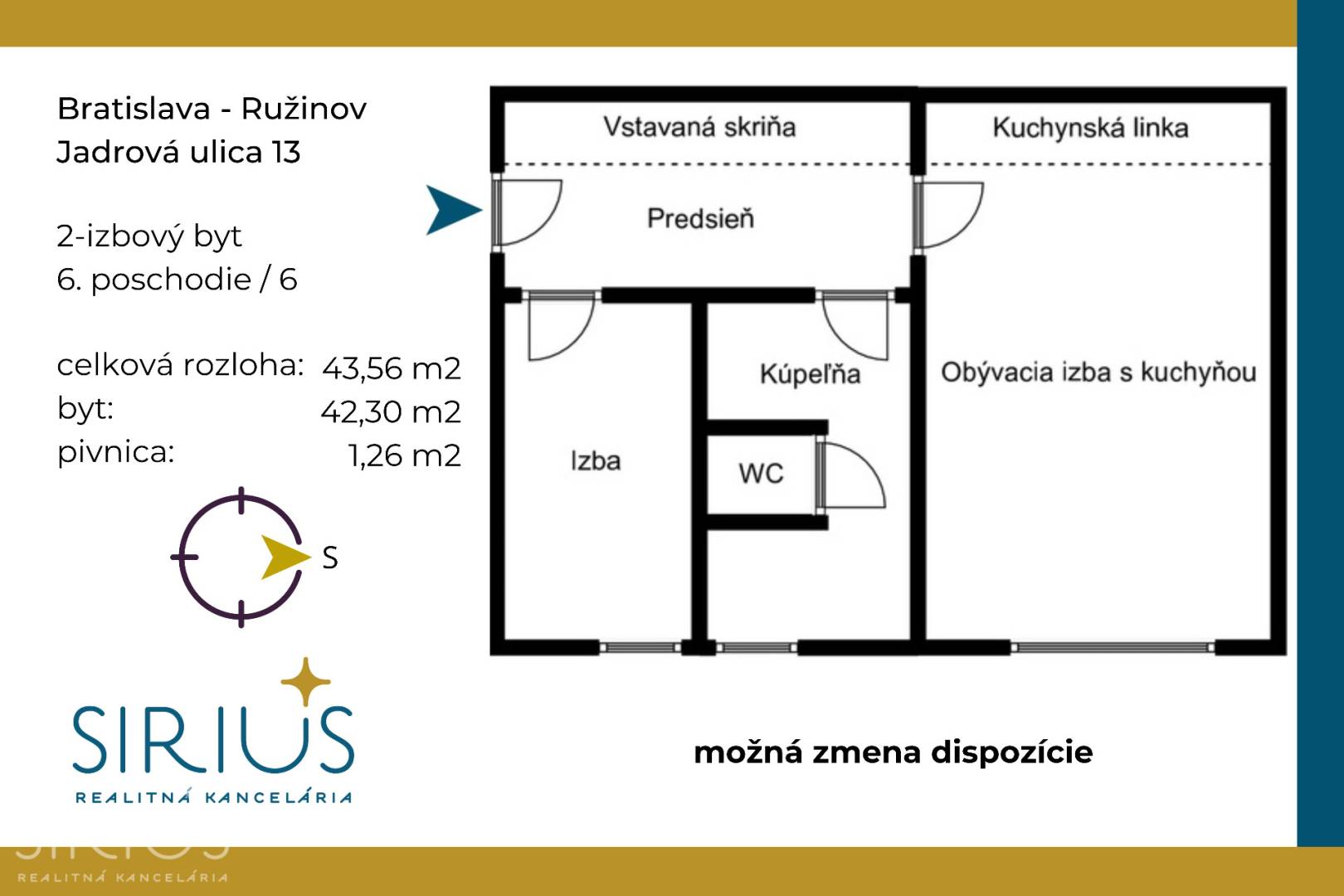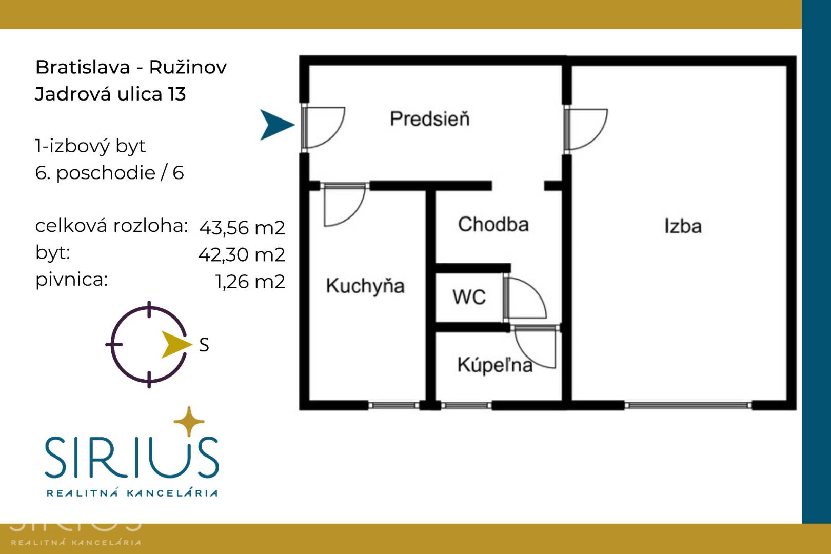 • celková plocha: 43,56 m2 (byt 42,30 m2 + pivnica 1,26 m2)