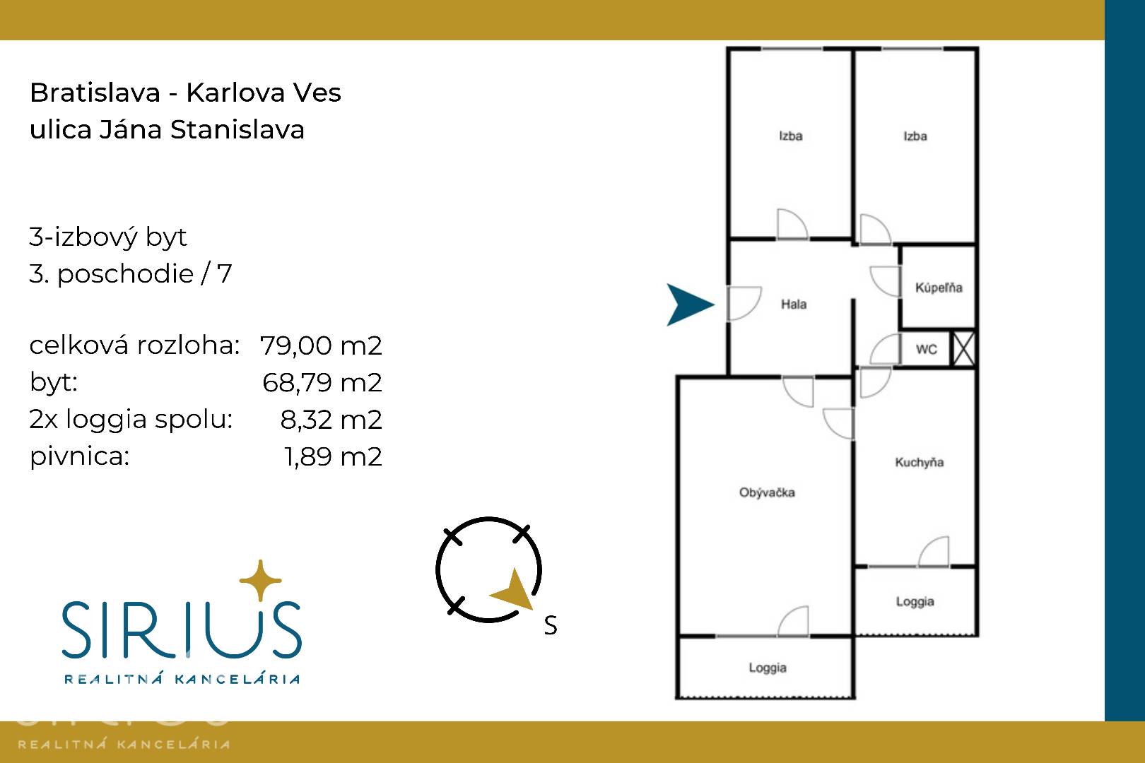 • celková plocha: 79,00 m2 (byt 68,79 m2 + 2x loggia spolu 8,32 m2 + pivnica 1,89 m2)