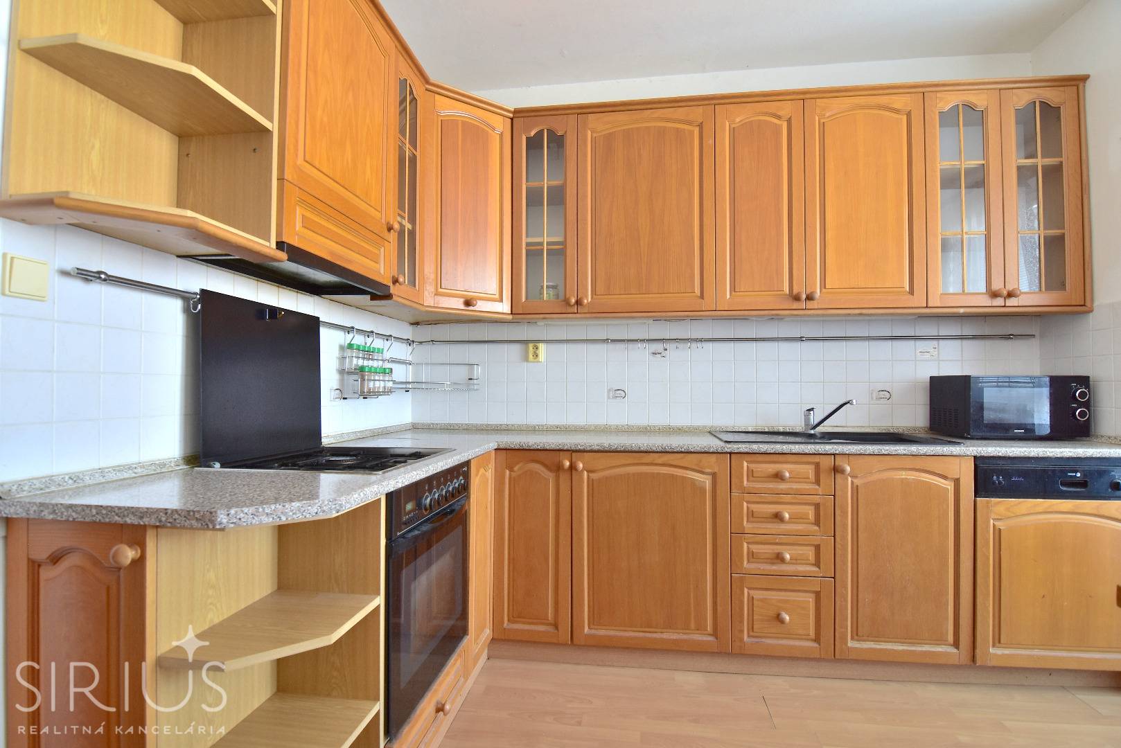 • kuchynská linka v tvare „L“ s dostatkom úložného priestoru a so vstavanou elektrickou rúrou, plynovou varnou doskou, staršou umývačkou riadu, chladničkou a mrazničkou