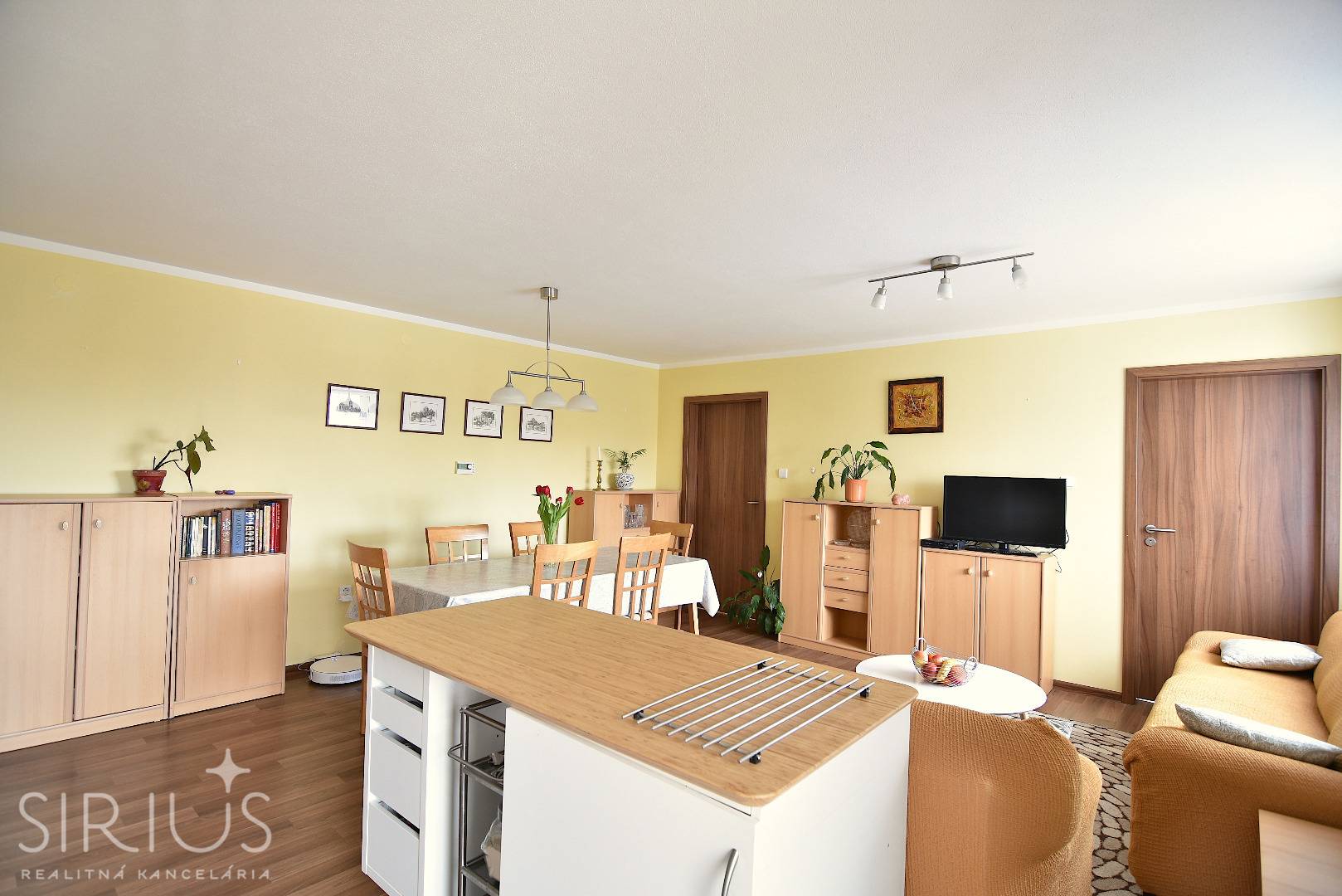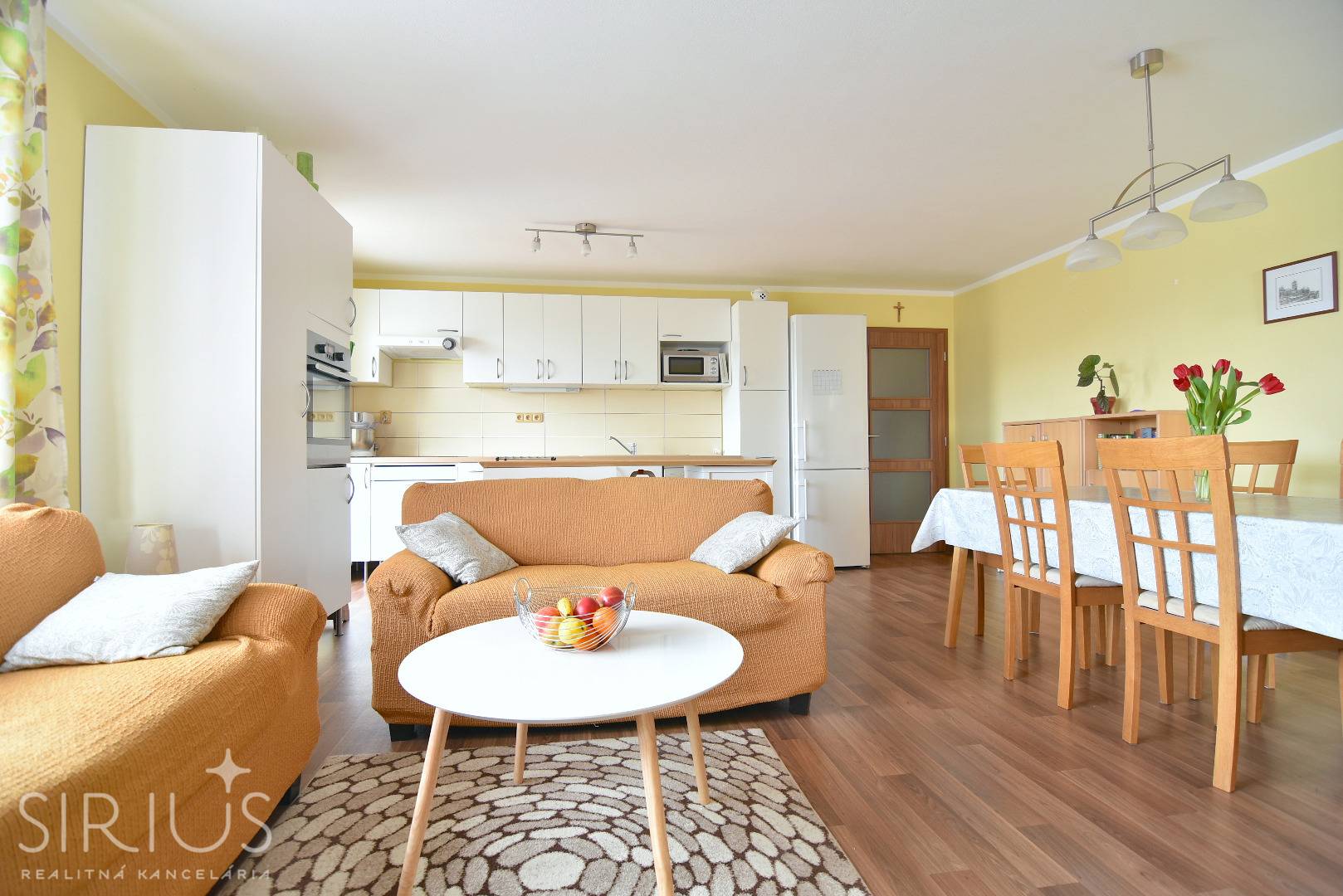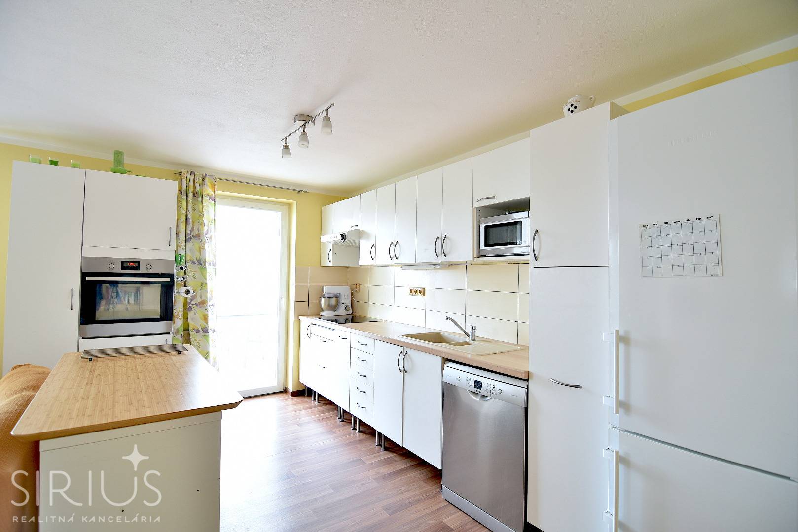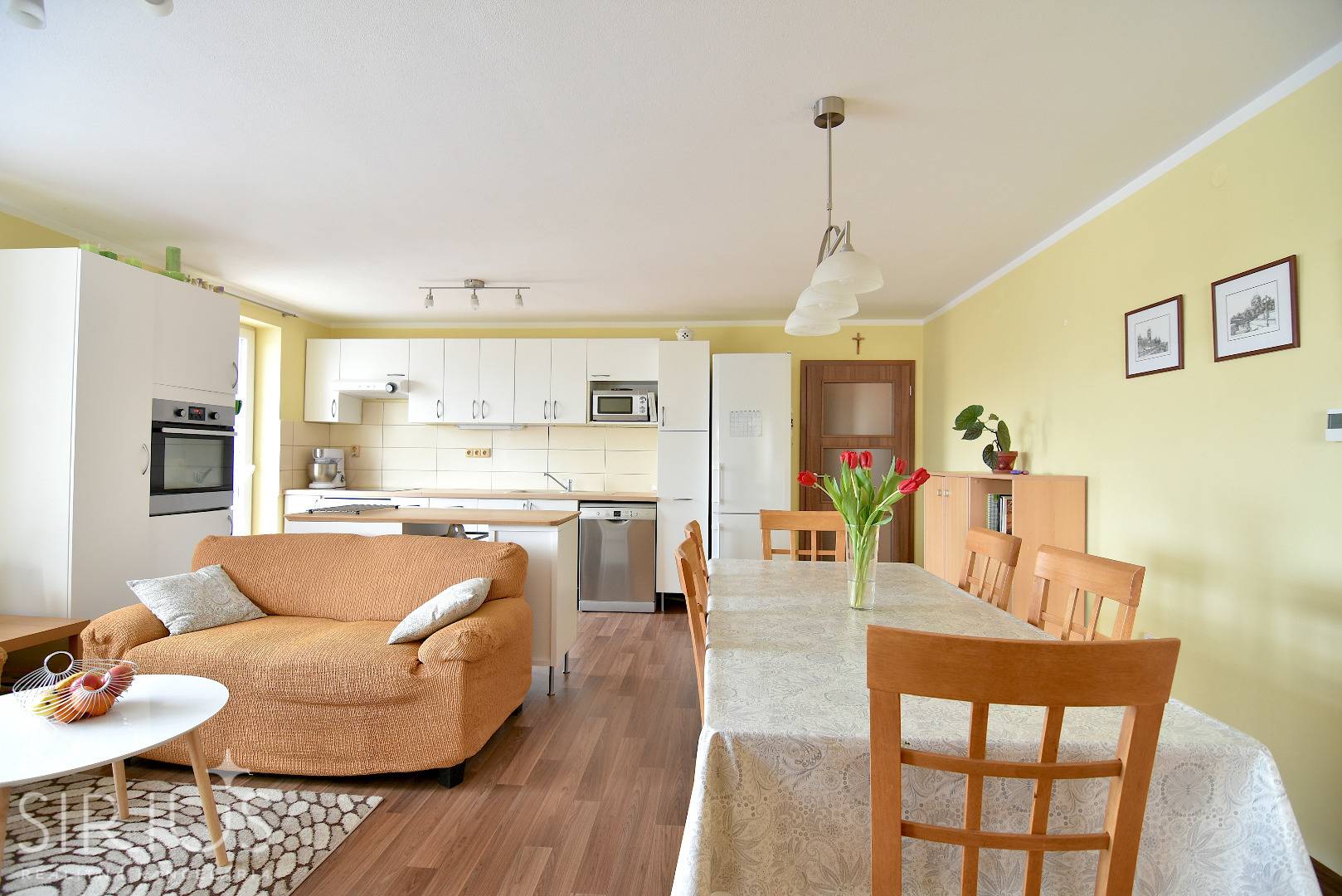 • kuchynská linka s dostatkom úložného priestoru a ostrovčekom, vybavená zabudovanými spotrebičmi (umývačka riadu, indukčná varná doska, digestor, elektrická rúra), miestom pre mikrovlnku a kombinovanú chladničku s mrazničkou