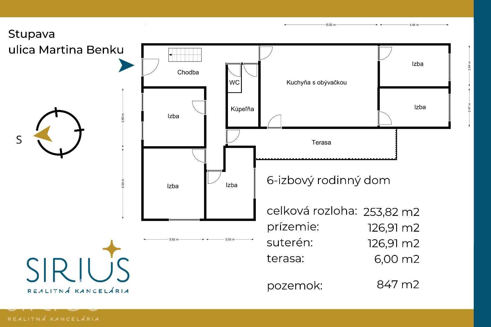 • celková rozloha: 253,82 m2 (prízemie 126,91 m2 + polozapustený suterén 126,91 m2) + terasa 6 m2 + garáž