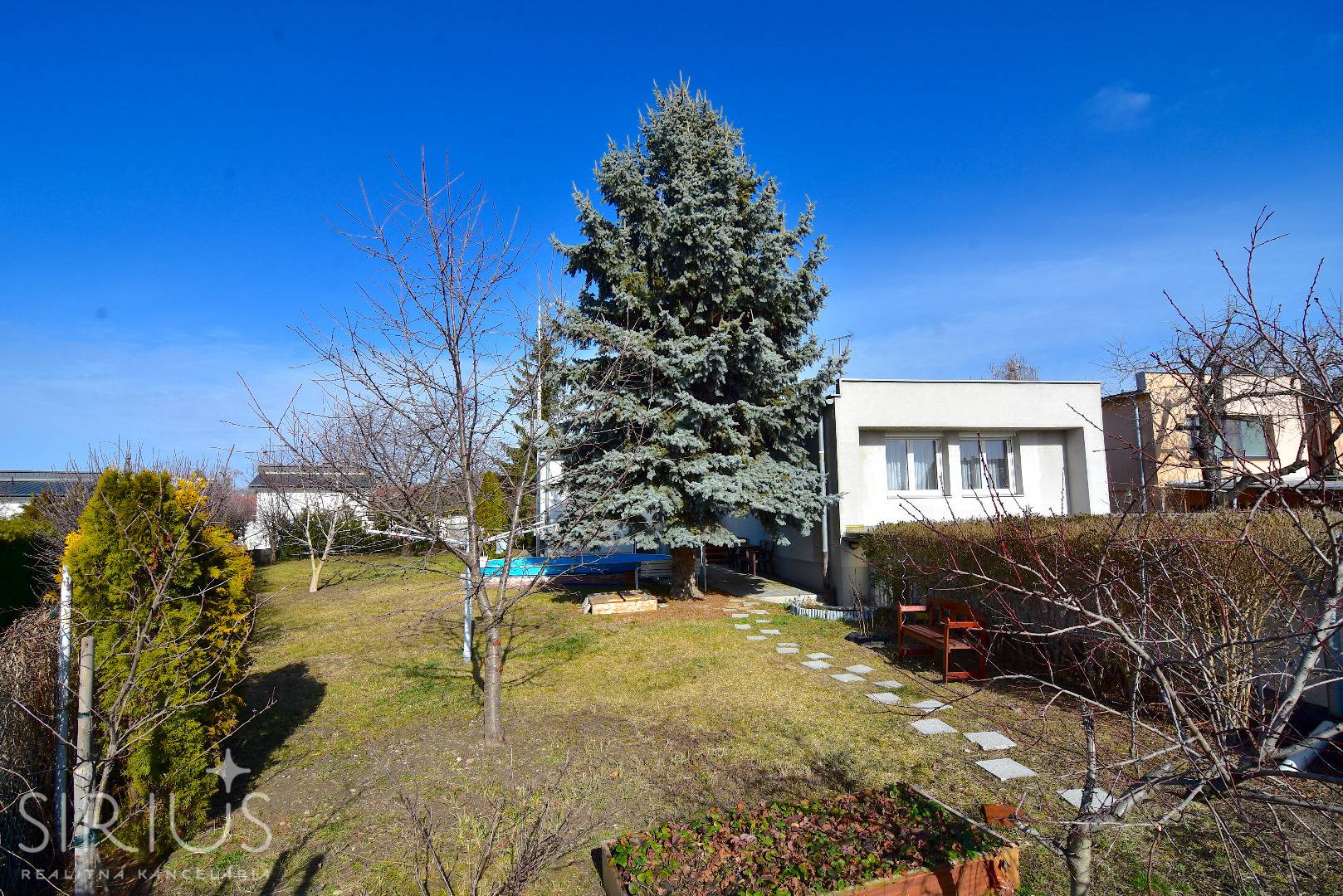 – vysadený trávnik, ovocné stromy (jablone, čerešne, hruška a slivka), vyvýšené záhony a okrasné rastliny a dreviny