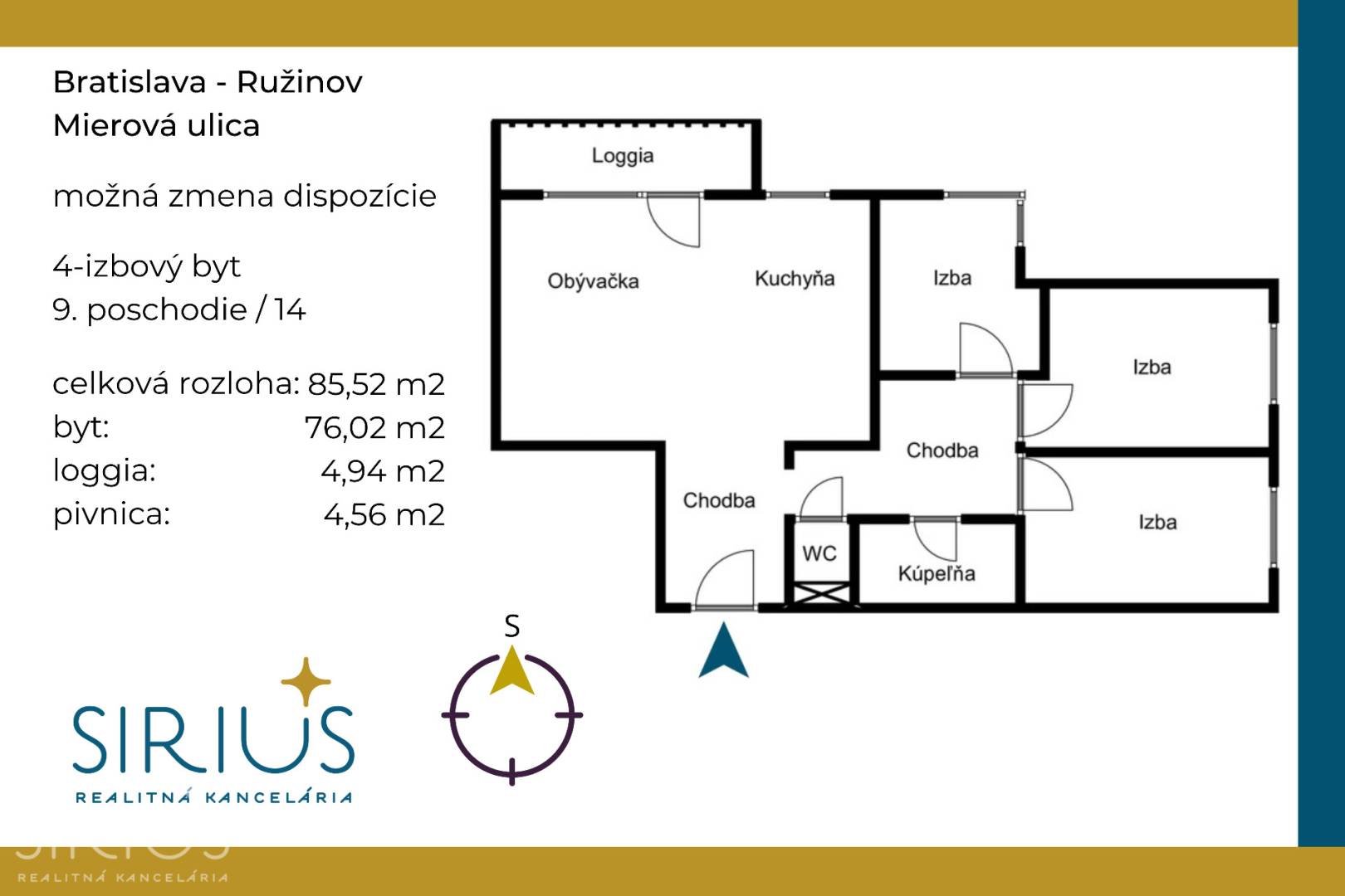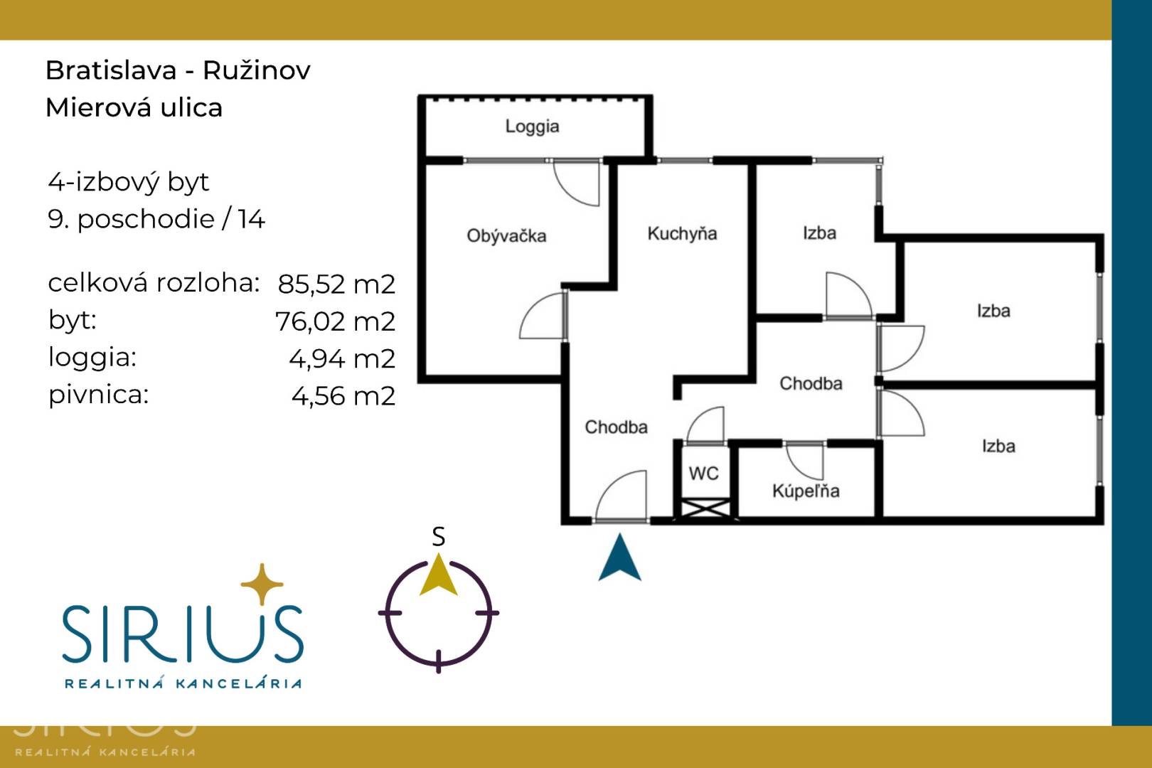 • celková plocha: 85.52 m2 (byt 76,02 m2 + loggia 4,94 m2 + pivnica 4,56 m2)