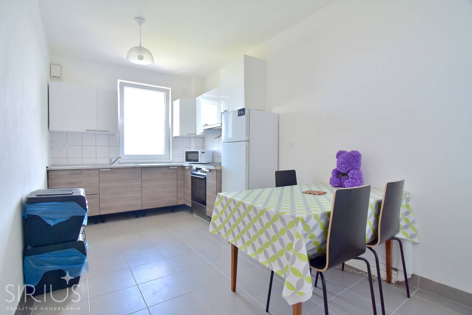 • kuchynská linka do L s veľkým oknom, vybavená spotrebičmi: zabudovaná elektrická rúra, varná doska, digestor, chladnička s mrazničkou