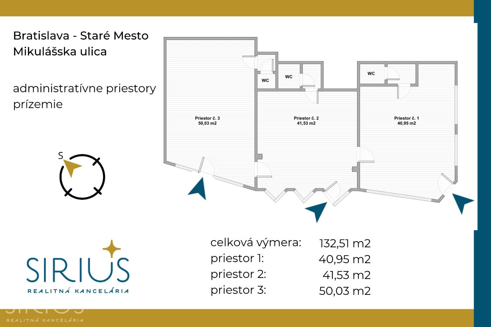 • celková plocha: 132,51 m2 (priestor 1 – 40,95 m2 + priestor 2 – 41,53 m2 + priestor 3 – 50,03 m2)
