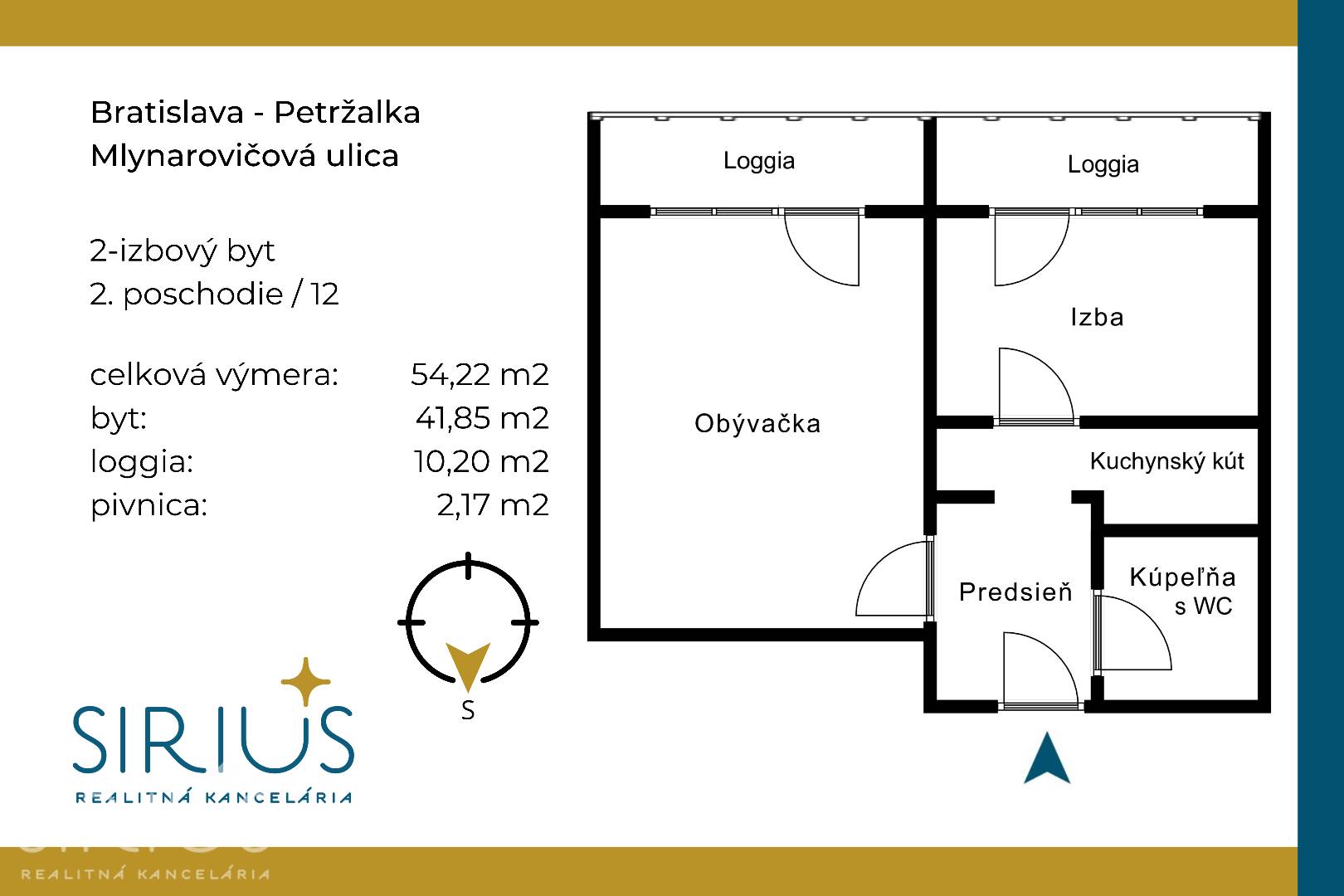 • celková plocha: 54,22 m2 (byt 41,85 m2 + 2x loggia 5,10 m2 + pivnica 2,17 m2)