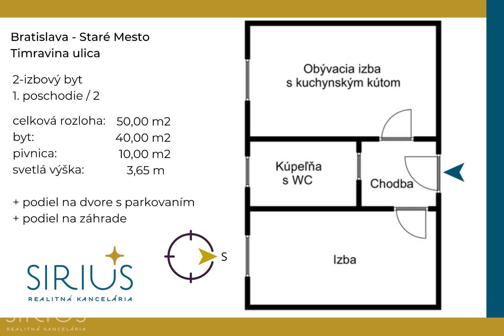 • celková plocha: 50 m2 (byt 40m2 + pivnica 10 m2)