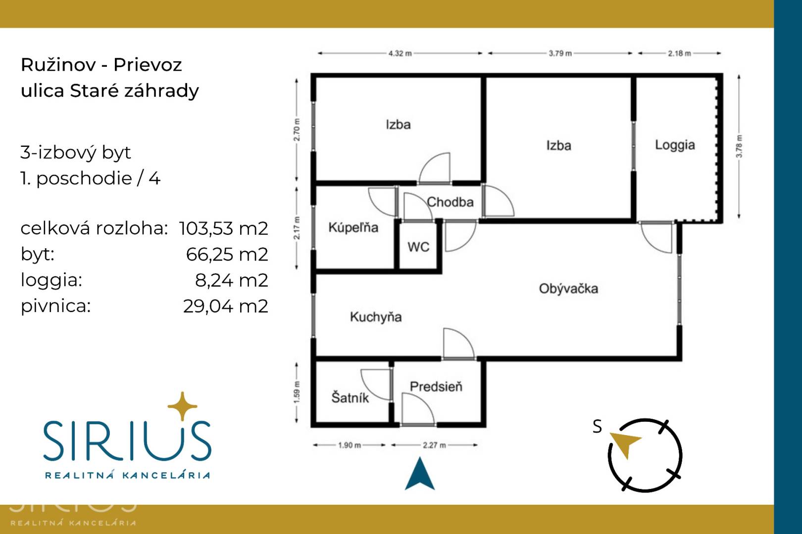 • celková plocha: 103,53 m2 (byt 66,25 m2 + loggia 8,24 m2 + pivnica 29,04 m2)