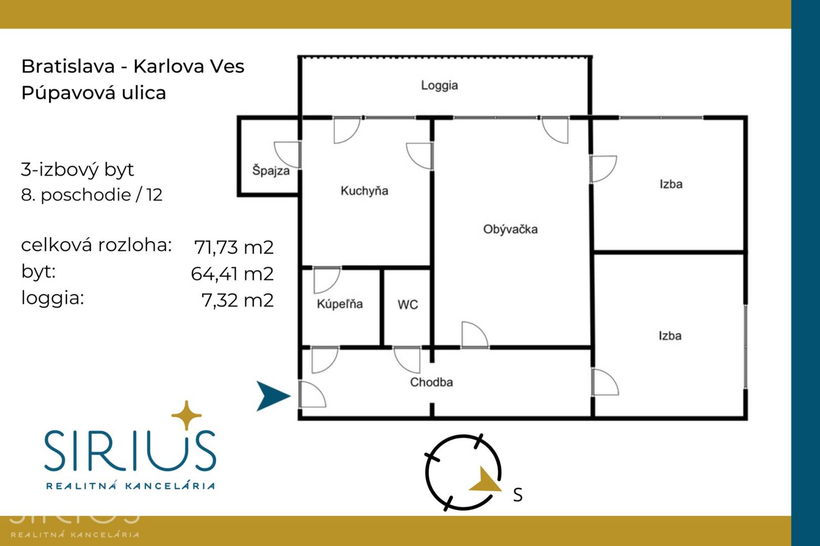 • celková plocha: 71,73 m2 (byt 64,41 m2 + loggia 7,32 m2)