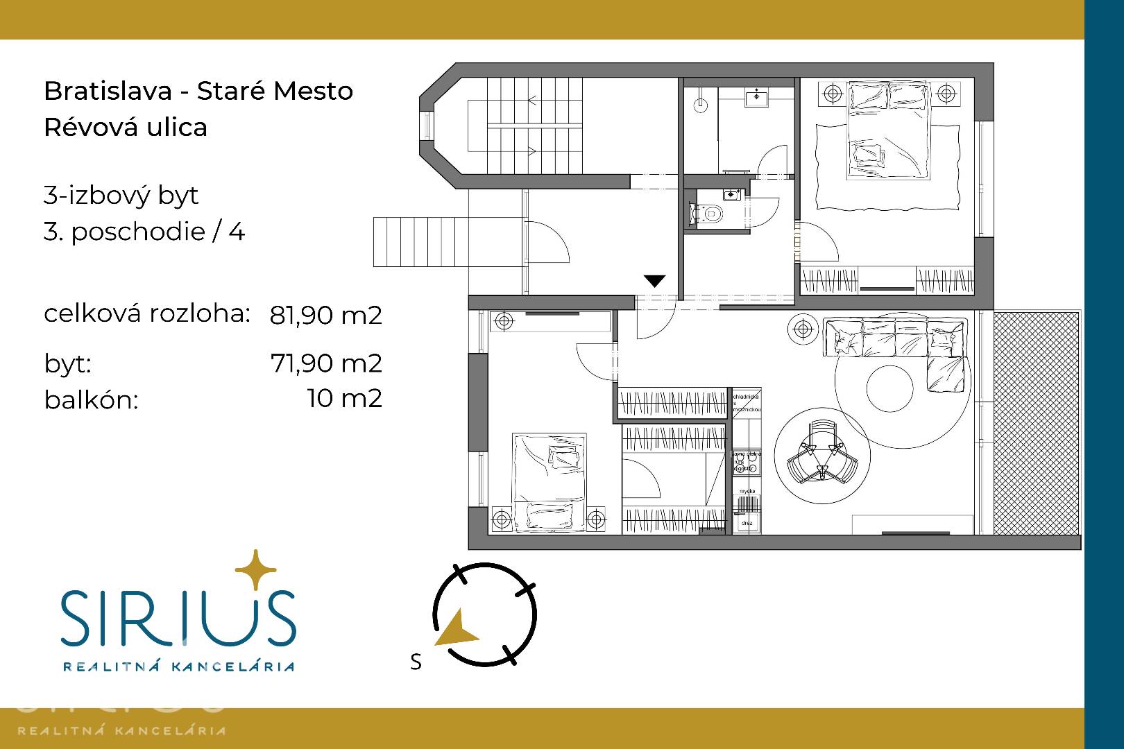 • celková plocha: 81,90m2 (byt 71,90 m2 + balkón 10 m2)