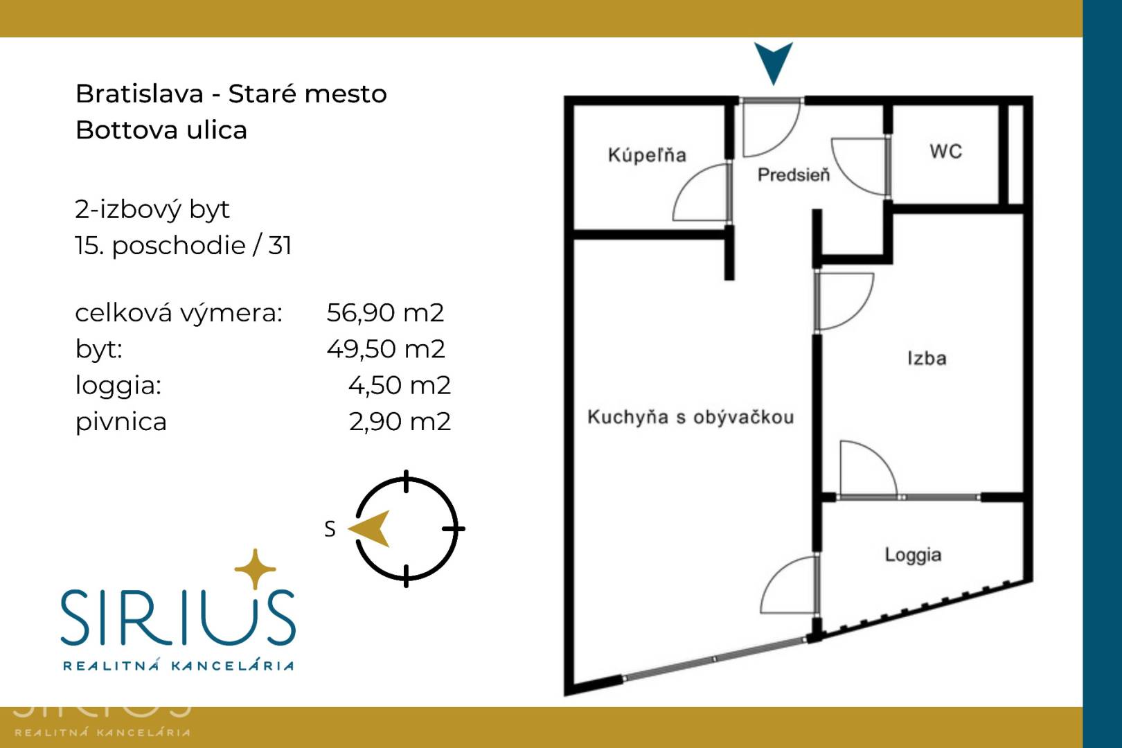 • celková plocha: 56,90 m2 (byt 49,50 m2 + loggia 4,50 m2 + pivnica 2,90 m2)