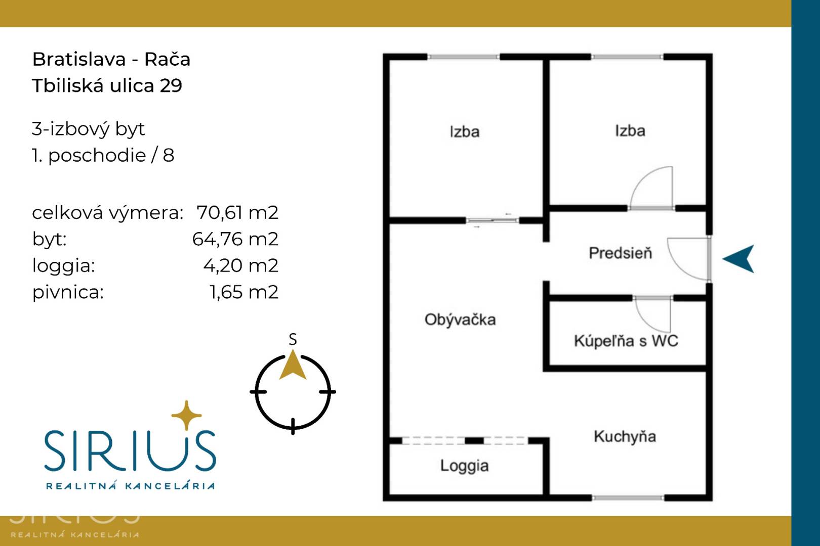 • celková plocha: 70,61 m2 (byt 64,76 m2 + pivnica 1,65 m2 + loggia 4,20 m2)