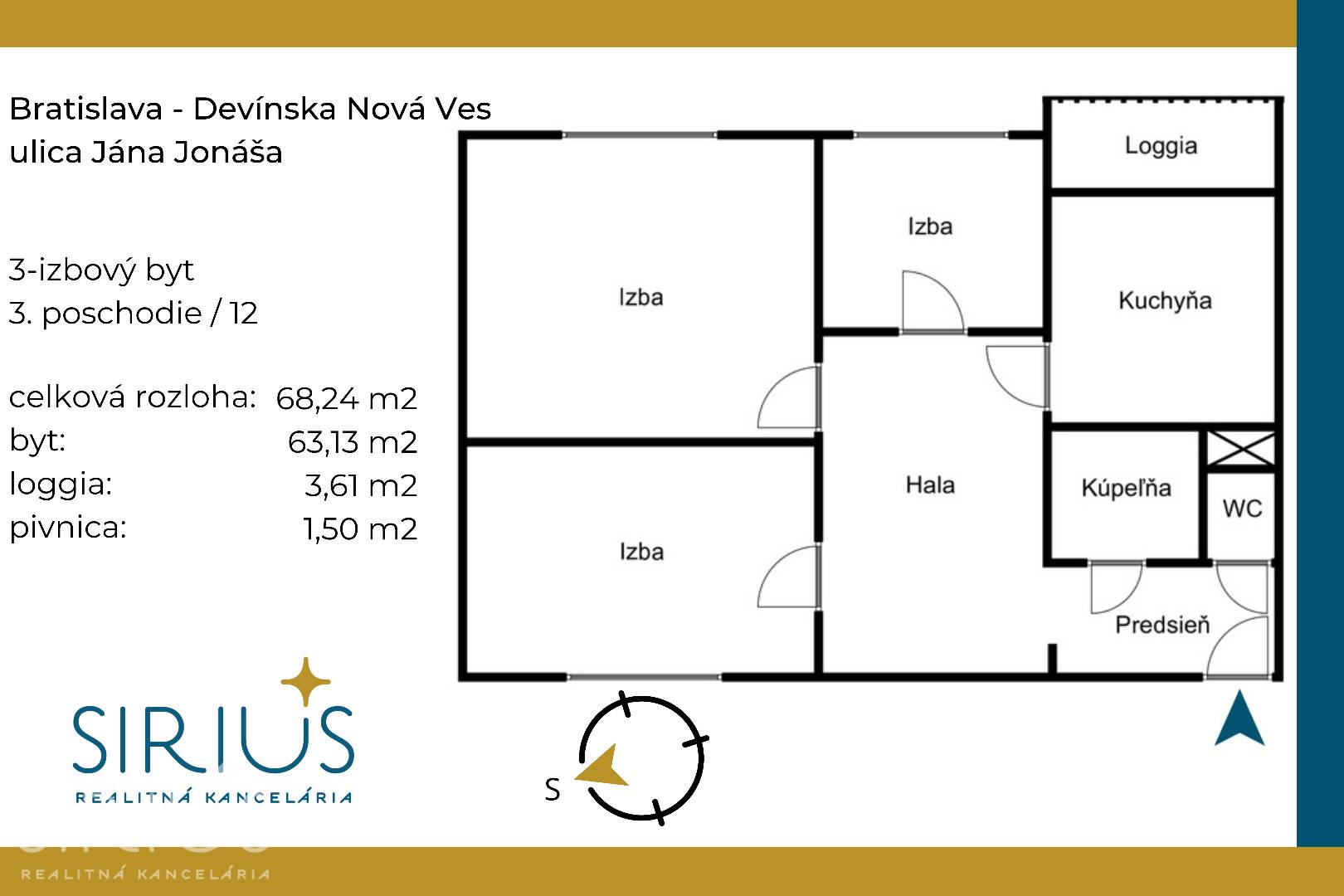 • celková plocha: 68,24 m2 (byt 63,13 m2 + loggia 3,61 m2 + pivnica 1,50 m2)