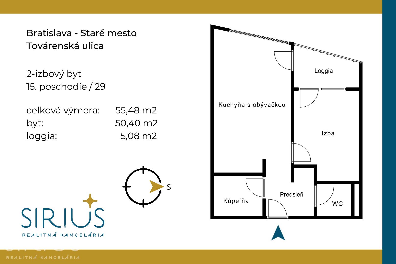 • celková plocha: 55,48 m2 (byt 50,40 m2 + loggia 5,08 m2)