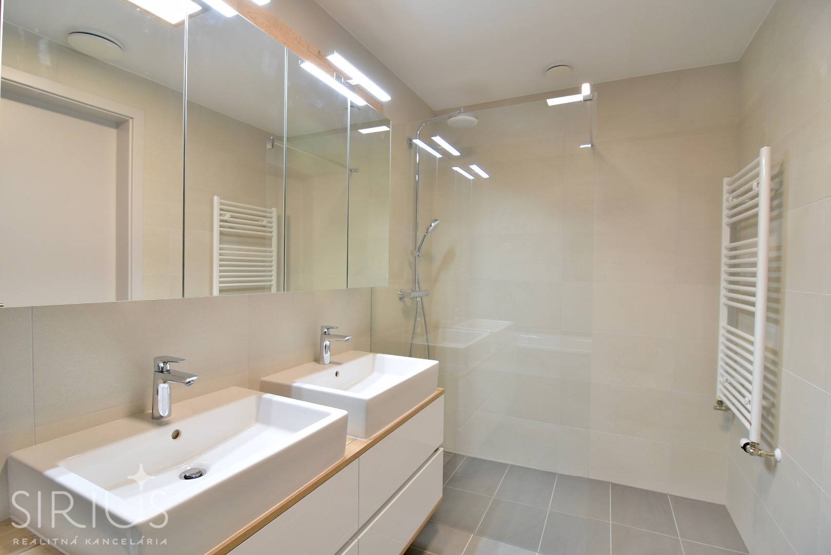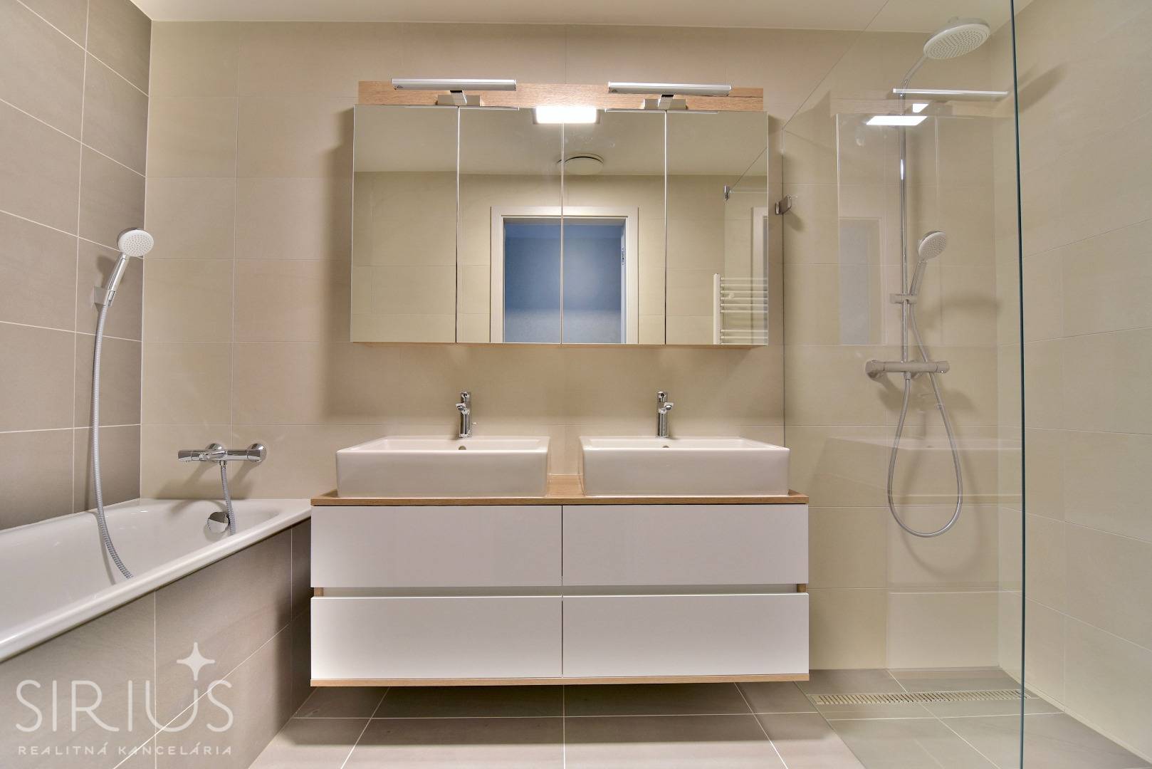 • kúpeľňa s vaňou, sprchovým kútom, dvoma umývadlami a rebríkovým radiátorom