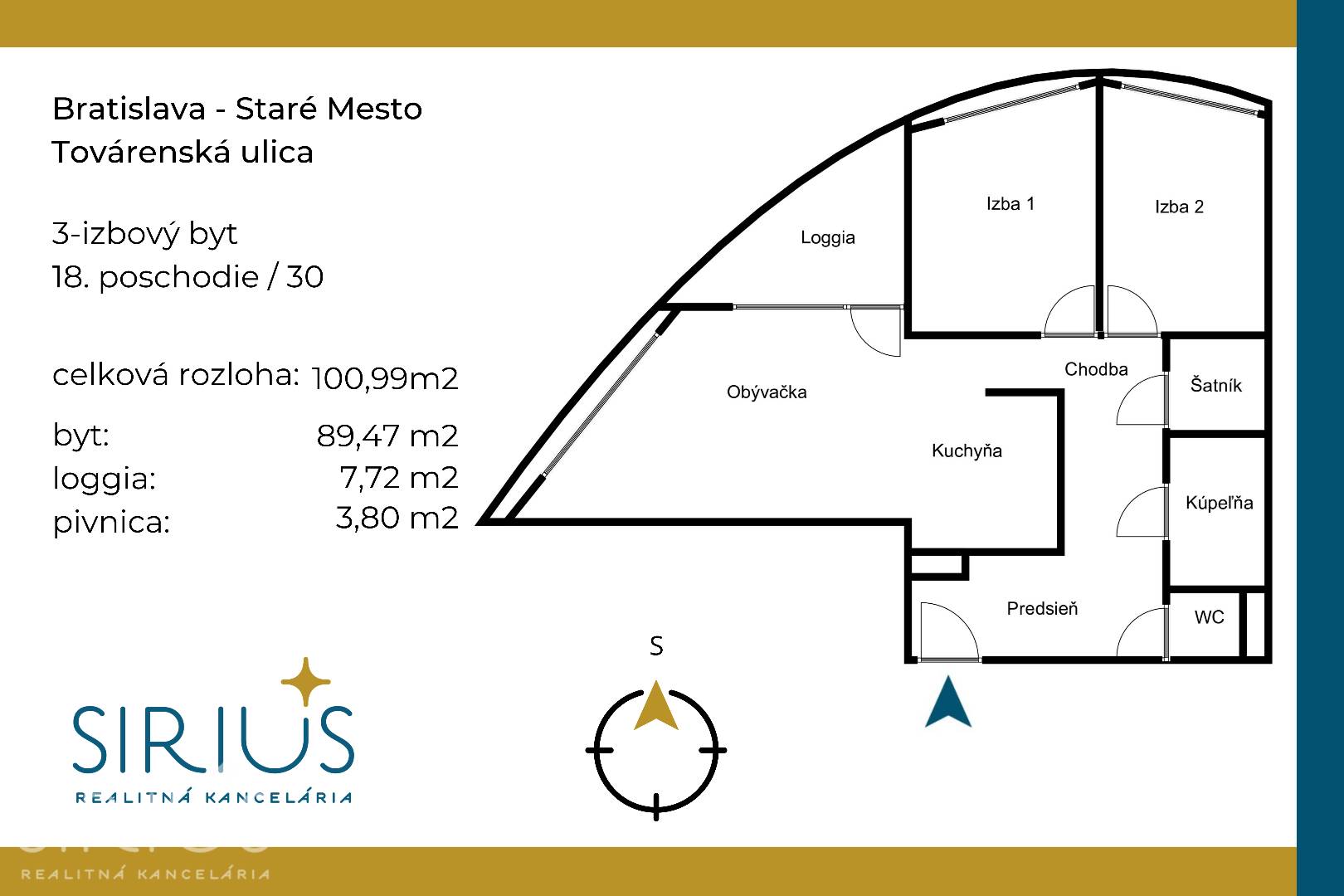 • celková plocha: 100,99 m2 (byt 89,47 m2 + loggia 7,72 m2 + pivnica 3,80 m2)