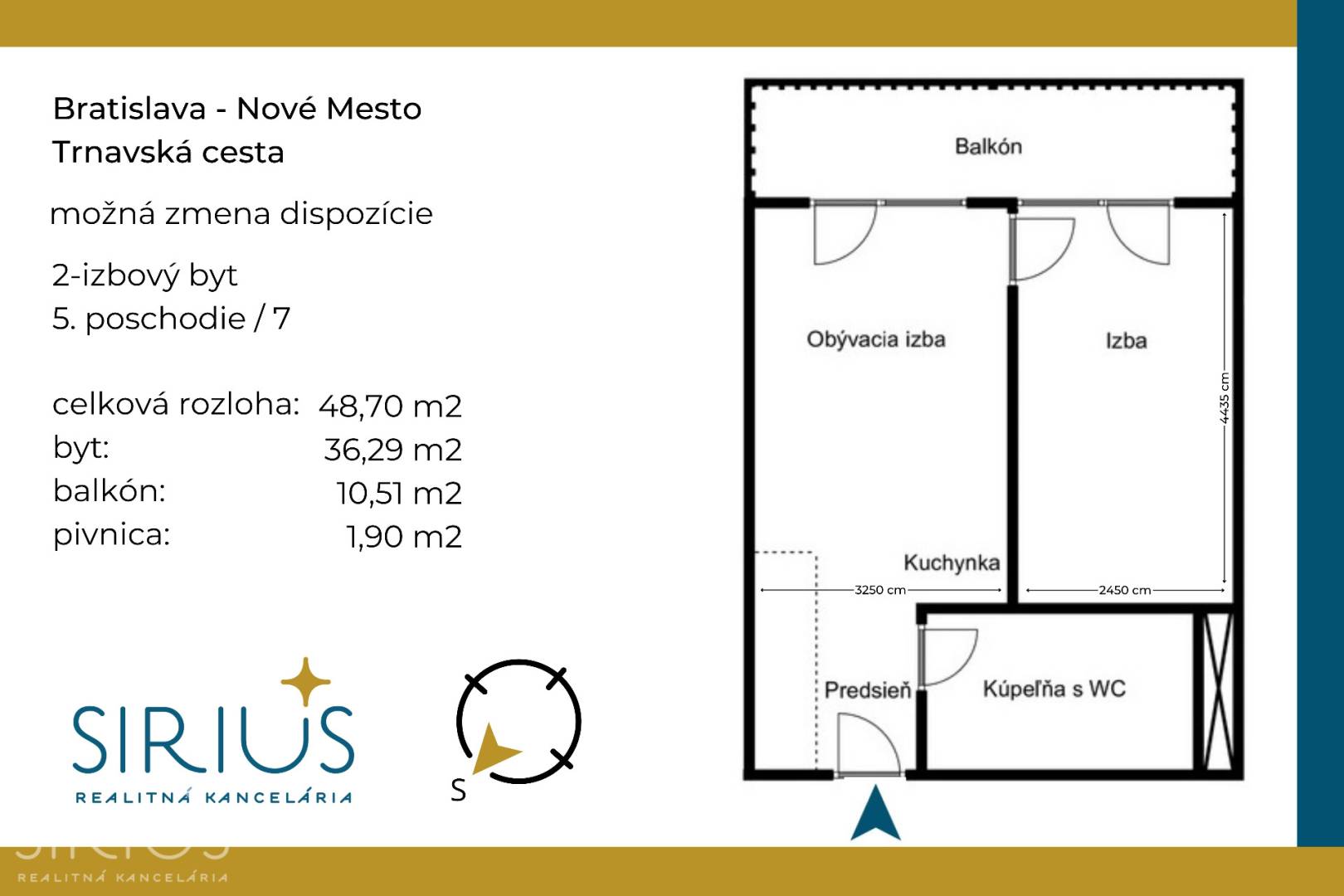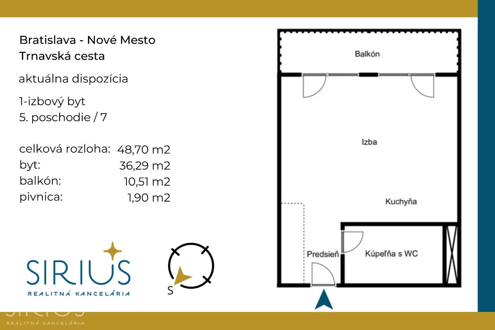 • celková plocha: 48,70 m2 (byt 36,29 m2 + balkón 10,51 m2 + pivnica 1,90 m2)