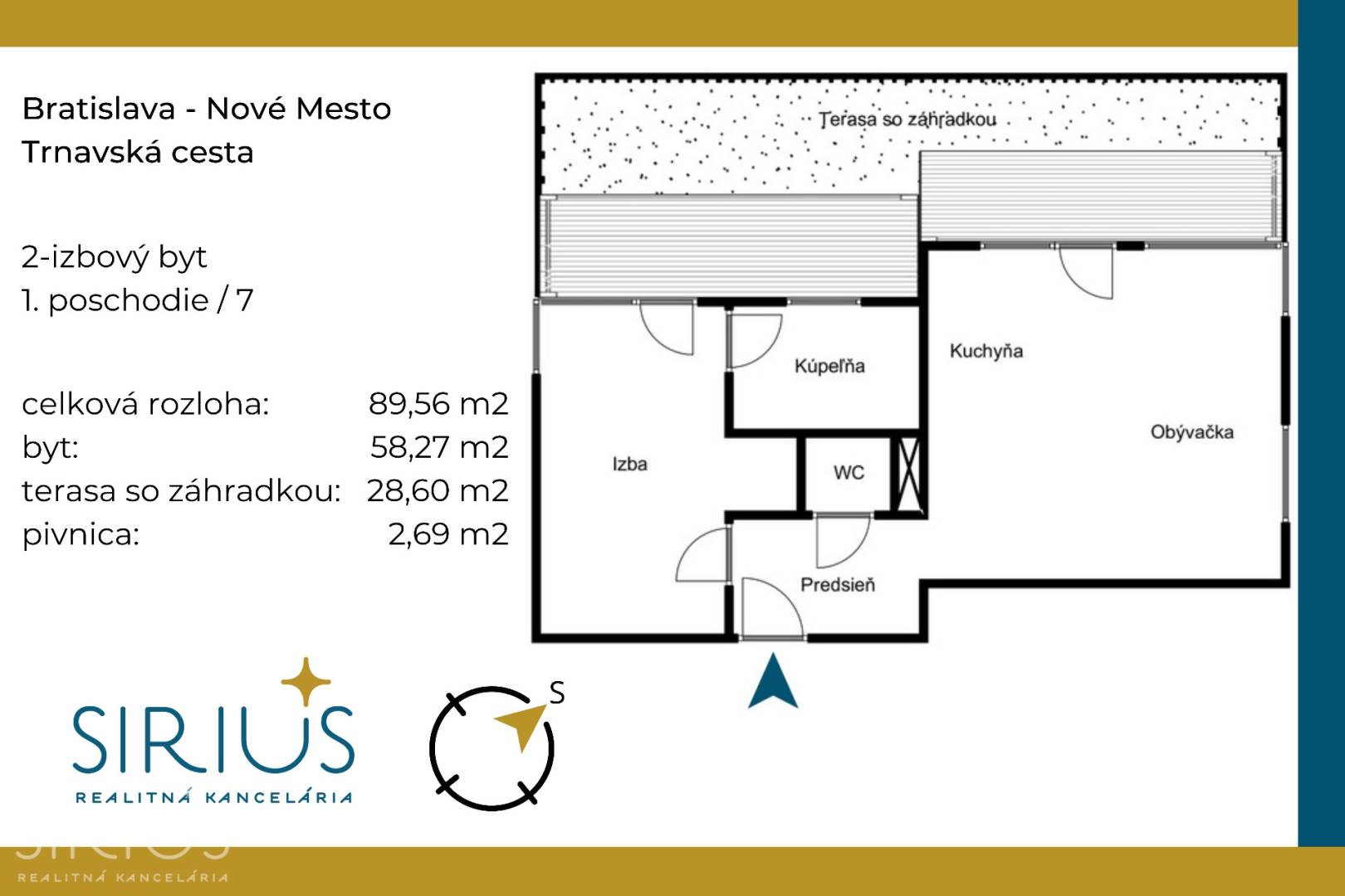 • celková plocha: 89,56 m2 (byt 58,27 m2 + terasa so záhradkou 28,60 m2 + pivnica 2,69 m2)