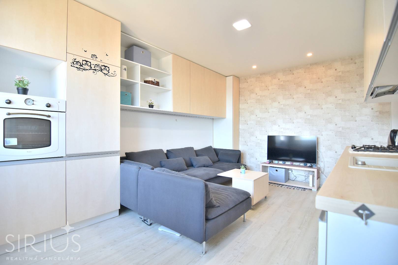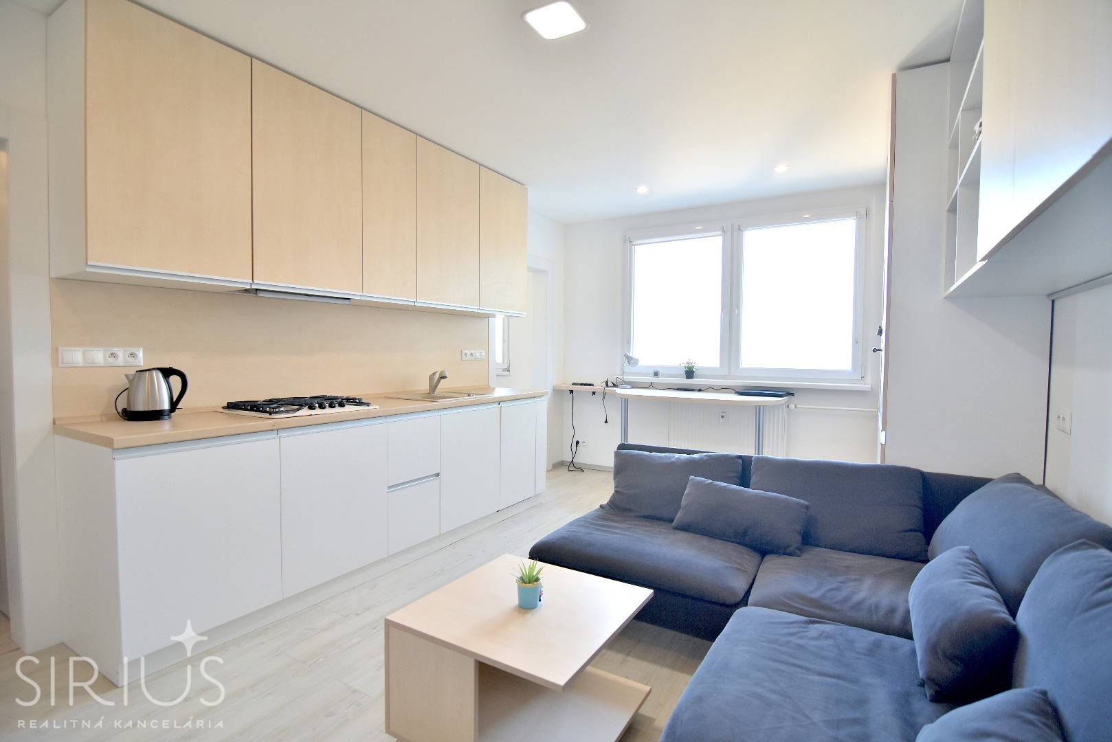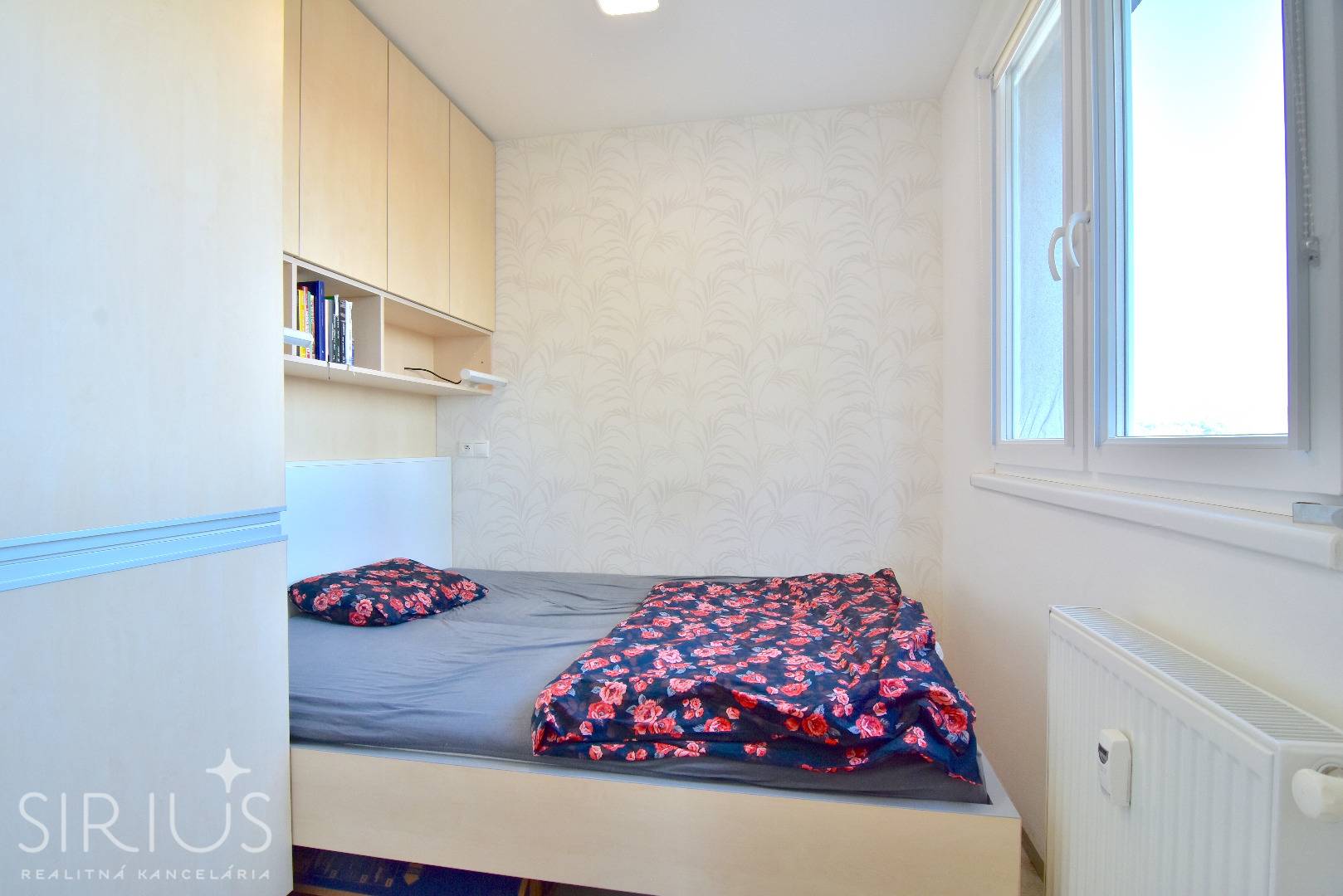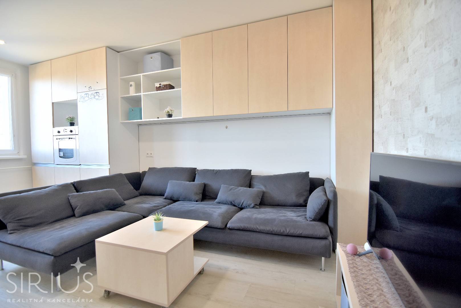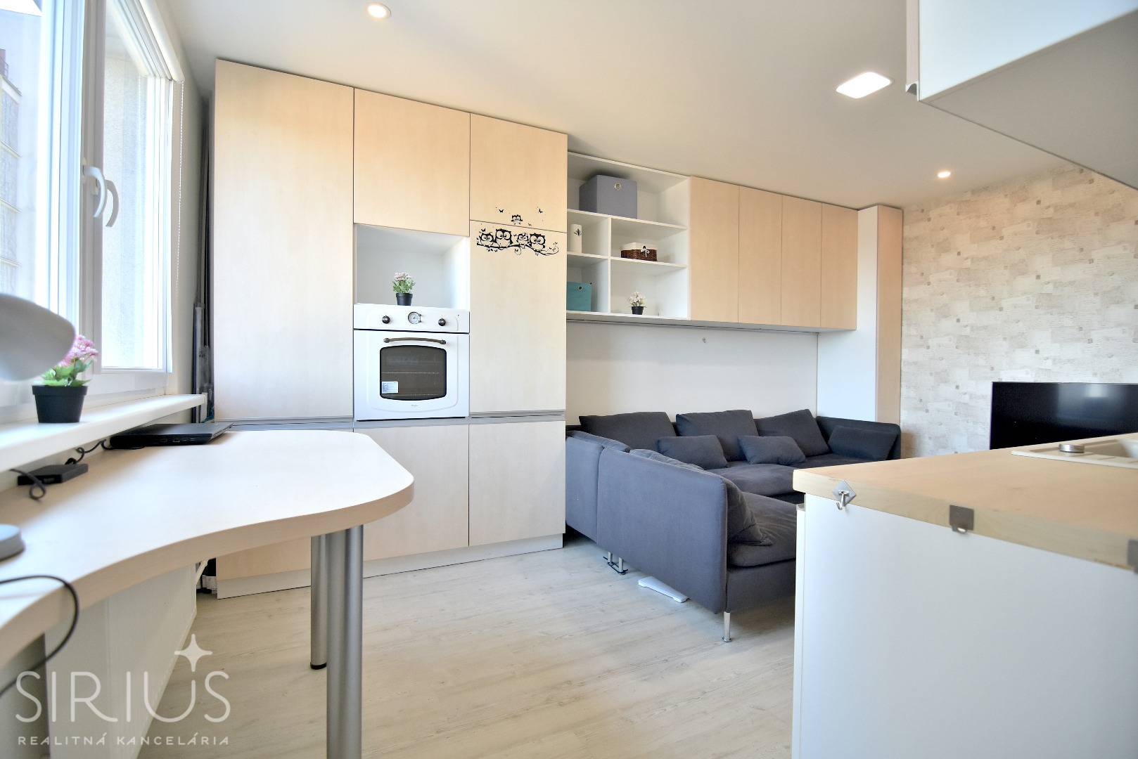SIRIUS Realitná kancelária exkluzívne ponúka na trhu jedinečne zrekonštruovaný byt s dôrazom na 100% využitie priestoru, zladenie použitých materiálov, nábytku a zariadenia vyrobeného na mieru. V byte je denná časť, kde má všetko svoje miesto a nebude vám tu nič chýbať. Samostatná spálňa, samostatná kúpeľňa s vaňou a samostatné WC. Nadštandardne veľa úložného priestoru a vynikajúca orientácia bytu, vďaka ktorej nebudete mať núdzu o denné svetlo, no zároveň bude v byte príjemná klíma.