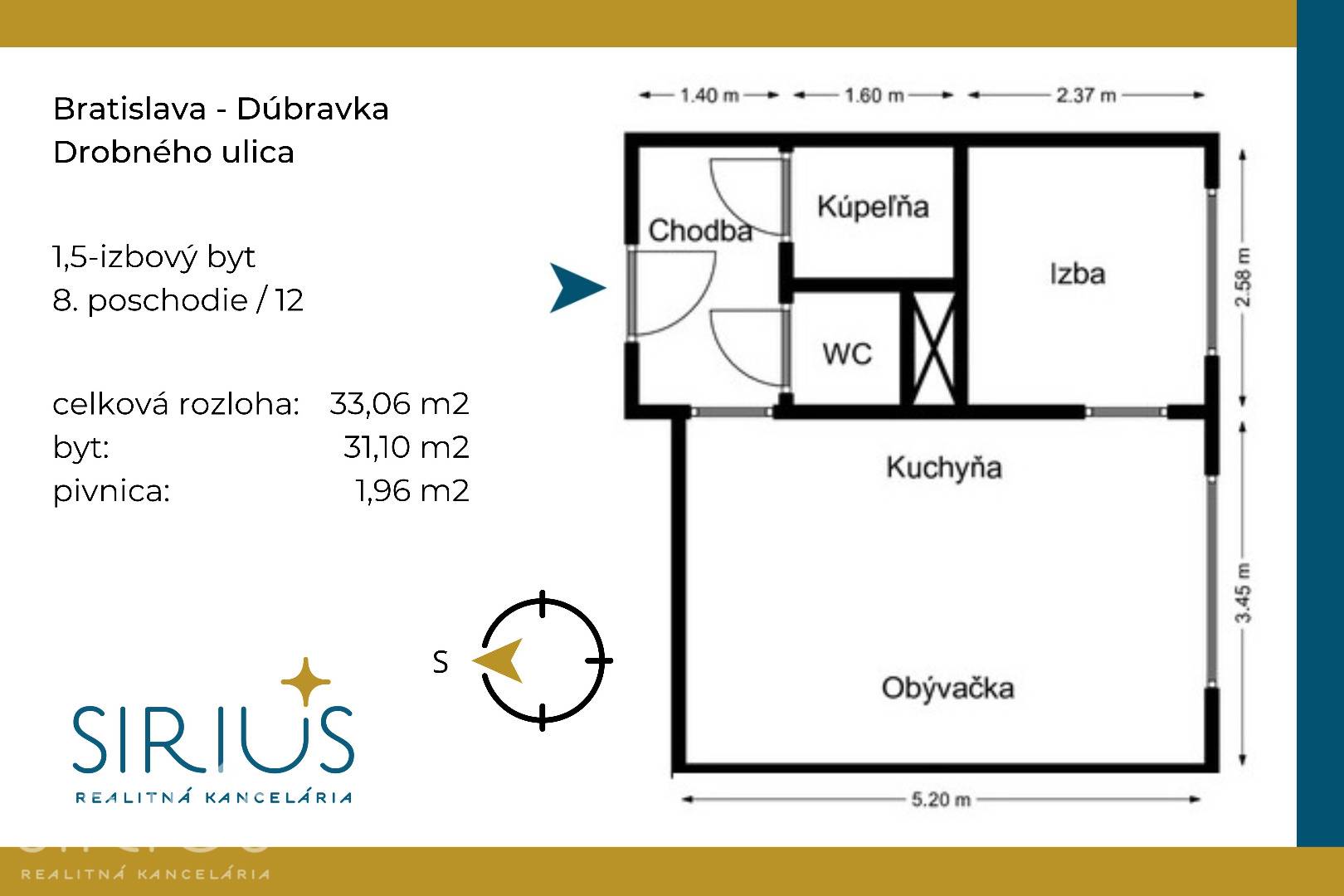 • celková plocha: 33,06 m2 (byt 31,10 m2 + pivnica 1,96 m2)