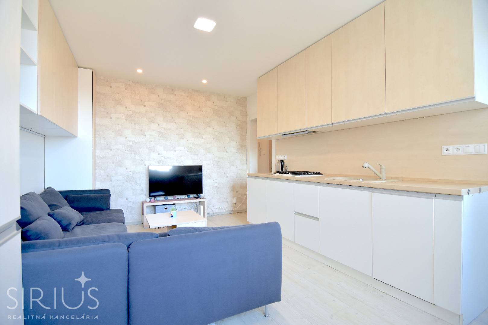• nadštandardná rekonštrukcia a architektom navrhnutá šikovná moderná dispozícia (obývacia izba spojená s kuchyňou a samostatná spálňa, vstupná chodba so vstavanou skriňou, kúpeľňa s vaňou a samostatné WC)